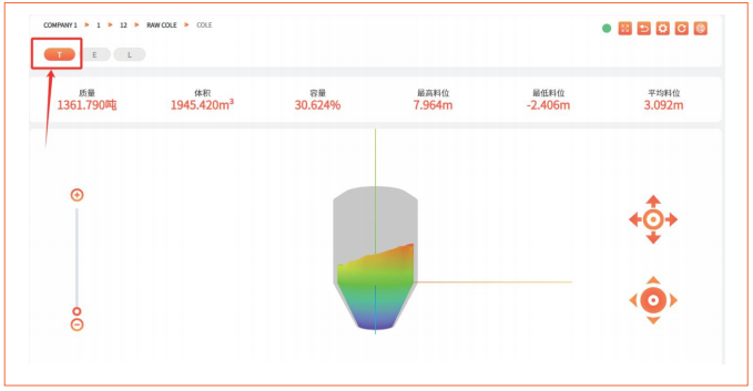 用于顯示罐體模型以及罐體內(nèi)物料表面的三維形態(tài)。在此狀態(tài)下,可通過+/-按鍵進(jìn)行放大縮小操作。罐體三維模塊的右側(cè)按鍵 ,點(diǎn)擊該按鍵