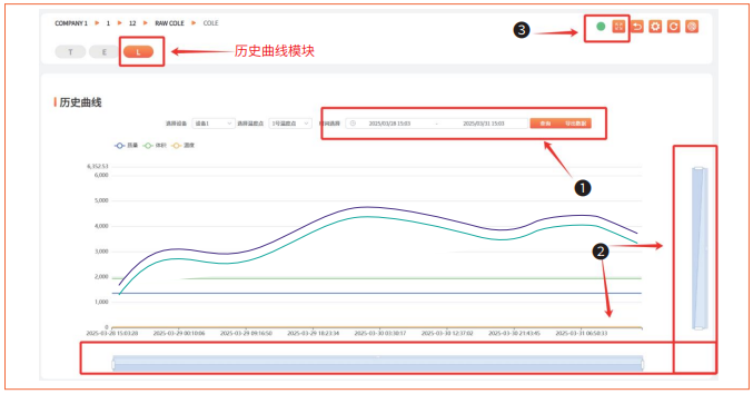 用于顯示罐體內(nèi)物料體積、質(zhì)量的歷史數(shù)據(jù),同時(shí)能夠根據(jù)歷史數(shù)據(jù)形成的歷史曲線觀察進(jìn)出料的趨勢(shì),此外,可將歷史數(shù)據(jù)導(dǎo)出,下載保存在固定路徑(同瀏覽器自身的下載路徑設(shè)置)