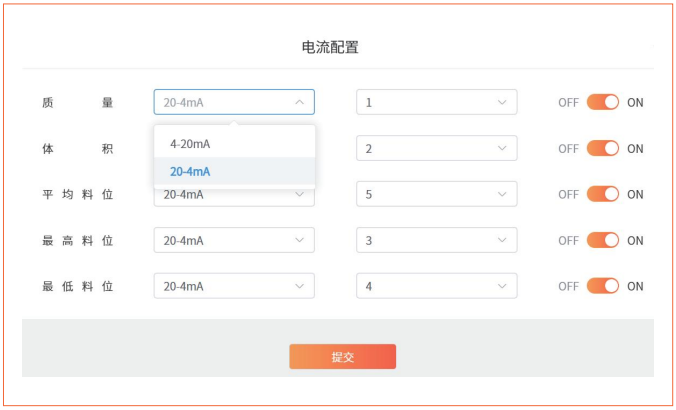 用于顯示計(jì)算獲得的對(duì)應(yīng)罐體內(nèi)物料的參數(shù):容量、體積、質(zhì)量、最高料位、最低料位、平均料位,另外,可顯示五個(gè)參數(shù)對(duì)應(yīng)的五路4-20mA模擬量電流。