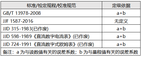 根據JJF 1587-2016,現在已使用最大允許誤差替代準確度等級用于表達數字多用表技術性能。但GB/T 13978-2008《數字多用表》之5.14.3給出:以規定基本測量不確定度的系數a和b之和作為等級指標。已作廢的JJG 315-1983《直流數字電壓表》之6.2、6.3給出:準確度等級以基本量程誤差系數(a+b)的大小和年穩定誤差來劃分。各標準對數字表等級定義主要依據如表1所示。