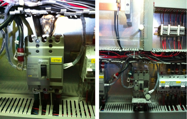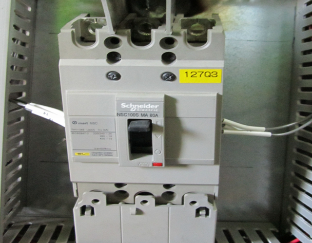 2、與其他元器件不同,該斷路器的接線緊固螺釘是穿透式的,緊固完線鼻后,螺釘距金屬安裝底板的間距不足2cm,當大電流通過,散落在后面溝槽的鐵屑會被大電流吸引過去,從而導致瞬間的對地短路。
